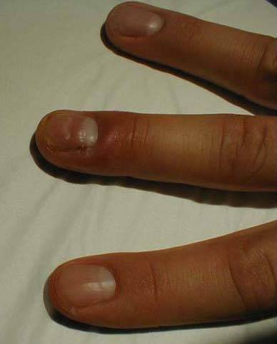 Paronychia: Infection of skin adjacent to nail of middle finger