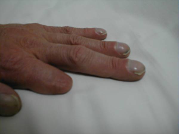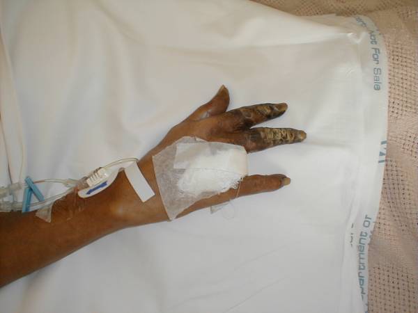 Peripheral Vascular Disease, Hand Tissue death (i.e. gangrene) of the fingers secondary to severe peripheral vascular disease.