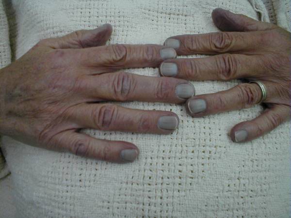 Cyanosis: A bluish discoloration visible at the nail bases