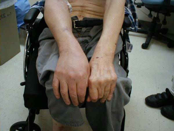 Right upper extremity DVT. Note diffuse swelling.