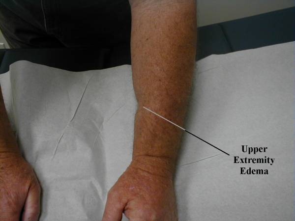 Upper extremity edema, when present, usually occurs focally over an area of